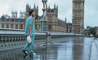 | The blue of Jim's scrubs stands out in the vast, empty city. Everything in this shot is out of place, even the carrier bag. |